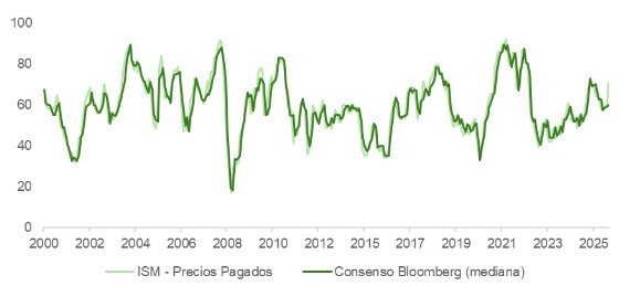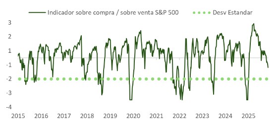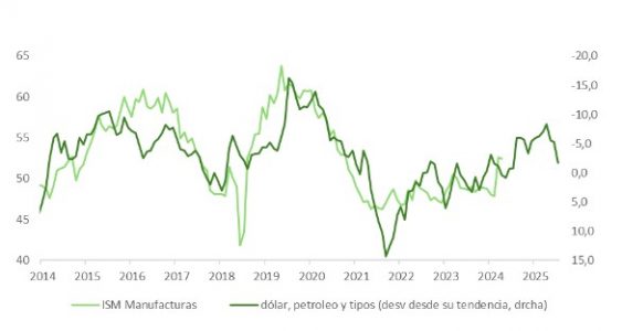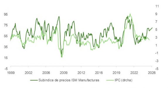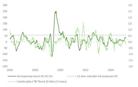 En el plano macroeconómico, la sorpresa al alza en el subíndice de precios pagados del ISM manufacturero, que encadena ya 17 meses consecutivos en zona expansiva, ha sido la mayor respecto a los estimados de Bloomberg jamás registrada, alcanzando su nivel más alto desde 2022. Los indicadores de actividad subyacente (nuevos pedidos, libro de órdenes, empleo) se mantienen en expansión y el ratio pedidos/inventarios sigue siendo favorable a una aceleración industrial. Sin embargo, la apreciación del dólar, la caída en el precio del bono y el encarecimiento del crudo actúan como freno potencial sobre esta incipiente tendencia.