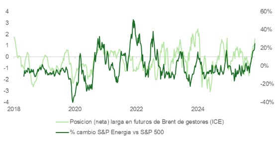 En el mercado de crudo, el barril ha acumulado una subida superior al 10% desde el inicio de los ataques. El movimiento podría ser aún más pronunciado si el conflicto se extendiera. Conviene matizar, no obstante, que los gestores ya habían comenzado a anticiparlo. El pasado viernes, las posiciones netas largas en futuros de Brent se situaban en +1 desviación estándar sobre la media, un nivel muy distinto al registrado justo antes de la invasión rusa de Ucrania, cuando el posicionamiento estaba en su media histórica.