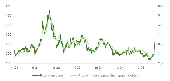 El riesgo real está en el consumo. Si el estrecho permanece cerrado de forma prolongada, el encarecimiento del barril se trasladará inevitablemente al surtidor, afectando tanto a las expectativas de inflación como al gasto de los hogares. El consumo privado en Estados Unidos ha venido creciendo por encima de las rentas reales (+1,6% frente a -0,6% en los últimos 10 meses, según el BEA), drenando ahorro y apoyándose en un efecto riqueza favorable que podría verse comprometido. Medidas como la apertura temporal anunciada para que India pueda adquirir petróleo ruso durante 30 días son parches insuficientes para contener una escalada de precios de mayor calado.
