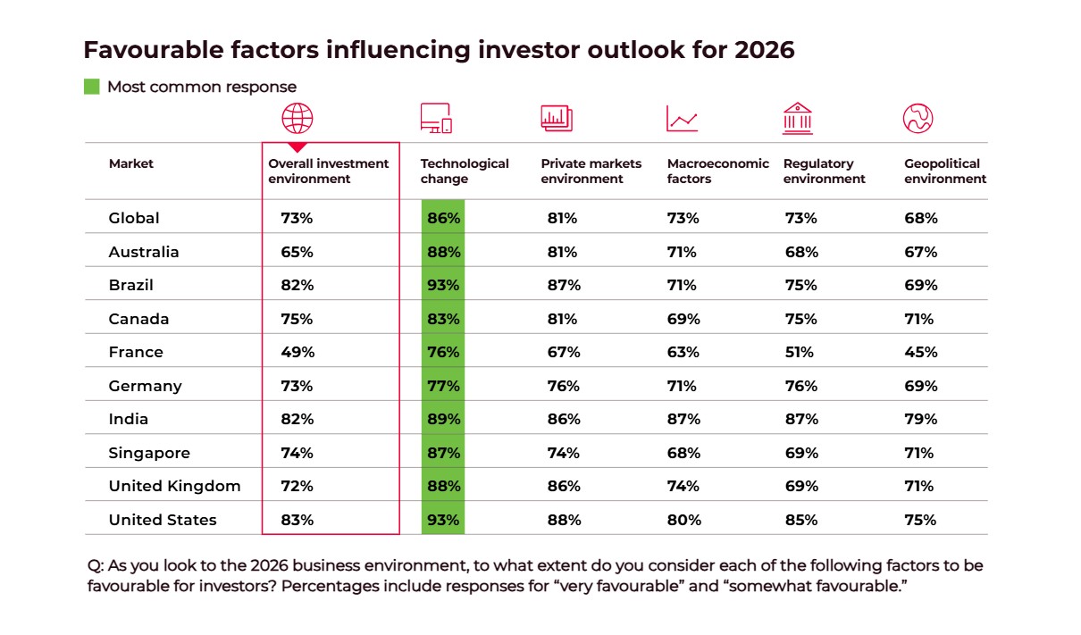 En medio de la turbulencia geopolítica persistente y del rápido cambio tecnológico, los inversores mantienen el optimismo sobre el entorno de inversión al comenzar el nuevo año. Cerca de tres cuartas partes (73%) tienen una visión positiva del entorno general de inversión de cara a 2026, un sentimiento similar al del año anterior. Los más optimistas son los inversores de EE.UU.: el 83% se siente positivo sobre el año que viene, frente al 64% en el mismo periodo de hace un año. En contraste, los inversores de Francia son los más cautelosos respecto a 2026: algo menos de la mitad (49%) expresa una visión positiva, seguidos por Australia, donde el 65% describe el entorno de inversión como favorable.