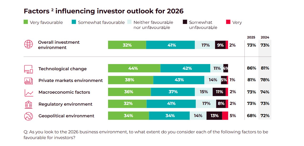 Según esta encuesta, que se lleva realizando tres años, el aumento de las preocupaciones por las tensiones geopolíticas y la volatilidad de los mercados ha hecho poco por reducir el entusiasmo de los inversores globales sobre el entorno de inversión del próximo año. La encuesta también refleja que tienen claro cuáles son las oportunidades de inversión: un 81% afirma que este será un año favorable para los mercados privados, un 86% considera que el cambio tecnológico es un factor favorable, y el 98% está integrando la IA en sus propios negocios.