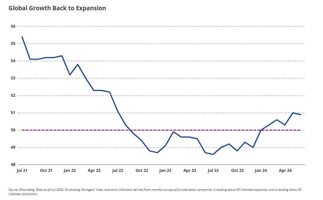 La economía mundial entró en modo de expansión a principios de año, tal y como miden los PMI mundiales. EE.UU. crece a un ritmo más lento, pero motores del crecimiento como la India han crecido rápidamente. Las estadísticas de crecimiento de China han sido relativamente débiles, aunque creo que están avanzando en la resolución de sus problemas inmobiliarios. Creo que el resto de Asia ha sido clave para impulsar el crecimiento mundial. Esto favorece la demanda de materias primas, y en el segundo trimestre vimos el inicio de un repunte de los precios de las materias primas.