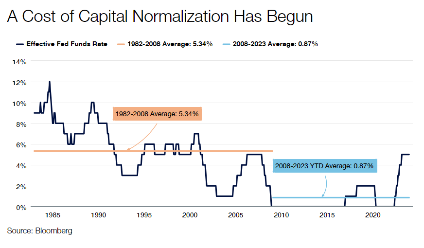 A medida que se resuelva la situación de crecimiento frente a recesión, y los mercados sigan digiriendo un coste del capital más normalizado (véase la ilustración anterior), esperamos rentabilidades más modestas para los inversores en renta variable y un entorno que puede favorecer a los valores que generan ingresos más estables. Mientras que el capital barato de la pasada década fue un viento de cola para las empresas con menos flujo de caja en la actualidad, pero mayores tasas de crecimiento potencial, la rápida subida de los tipos que comenzó en marzo de 2022 debería apoyar a las empresas más maduras con perfiles de flujo de caja consistentes, fuertes barreras de entrada y la capacidad de autofinanciar el crecimiento futuro. Si todo esto se desarrolla como esperamos, es probable que los ingresos desempeñen un papel aún más importante de lo habitual en la rentabilidad total de la renta variable.